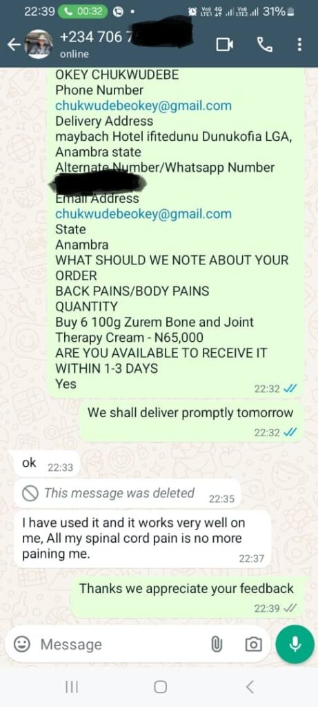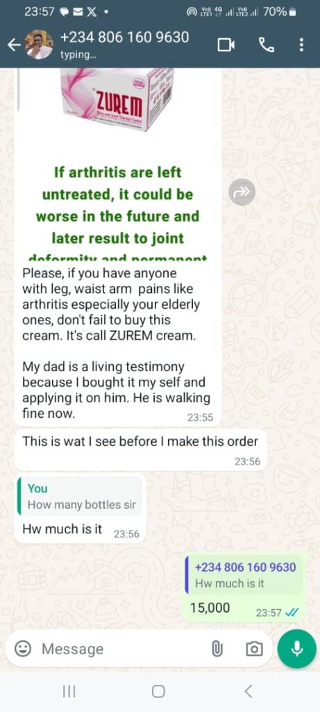 “I was diagnosed with arthritis a few years ago and have been struggling with limited mobility and pain in my joints ever since. I tried different over-the-counter medications, but none of them seemed to help. Then I heard about Zurem™ Joint & Bone Therapy Cream. I decided to give it a try and within a few weeks, I noticed a decrease in pain and swelling. After a month of using the cream, I was able to move more freely and even resume some of the physical activities I had given up due to my condition. I am so thankful that I found Zurem™ Joint & Bone Therapy Cream. It has made such a difference in my life and I would highly recommend it to anyone suffering from arthritis or osteoporosis.” – John Okeke, Surulere, Lagos